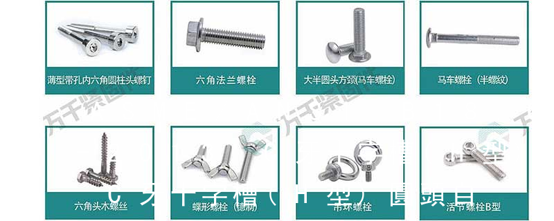 螺栓有:1、方頭螺栓,2、半圓頭方頸螺栓,3、十字槽盤頭螺釘,4、內六角沉頭螺釘,5、方螺母C級,6、蝶形螺母,7、六角頭螺栓,8、十字槽盤頭自攻螺釘。大小有M18、M6、M8、M16、M10、M12、M14、M20等型號。通常用